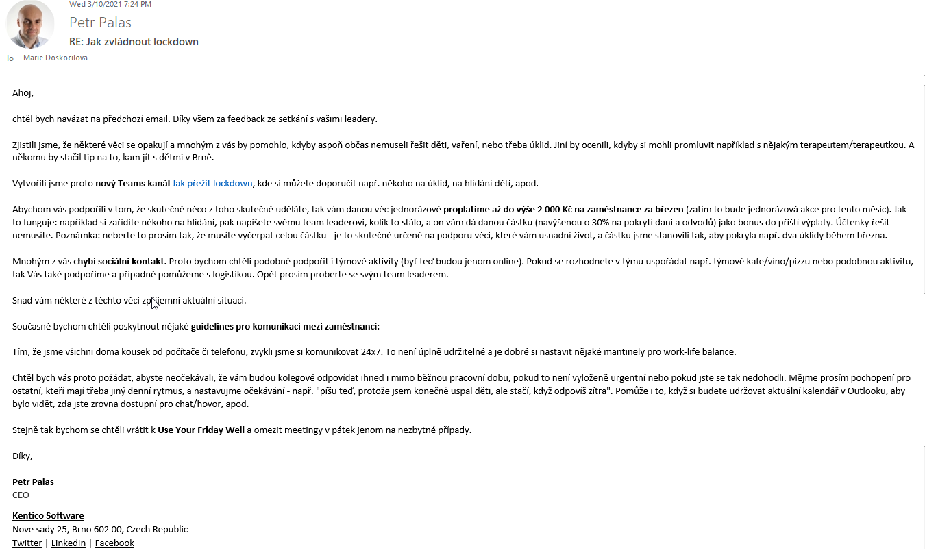 Pečlivě naloďujeme kolegy a kolegyně online – vytváříme seznamy, pravidelně se scházíme a ladíme onboarding tak, aby byl pro začátečníky ve firmě co nejpřínosnější. Vrátili jsme se také k podpoře teambuildingových akcí. Když se skupinka domluví na online setkání, Kentico přispěje na občerstvení a ještě pomůže s logistikou. - Balancujeme práci a soukromí